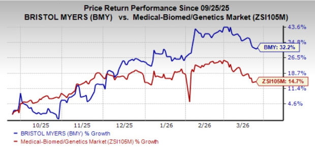 Shares of Bristol Myers have surged 32.2% in the past six months compared with the industry’s growth of 14.7%.