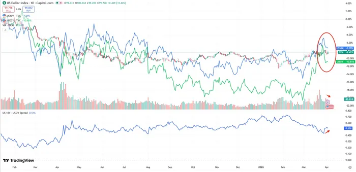 Currency and rates markets provide additional evidence of improving macro stability. The U.S. dollar remains firm, supported by elevated oil prices and geopolitical demand for safety. However, the decline in the 2 year Treasury yield, combined with a relatively steadier long end, has allowed the 10 year minus 2 year spread to widen modestly. This partial normalization of the yield curve reflects a shift toward more balanced expectations. That could largely be attributed to Powell's view that the current oil shock is transitory, which reduces the likelihood of rate hikes this year.As the bond market stabilizes, pressure on equities may gradually ease, limiting the scope of further downside unless a new shock emerges.