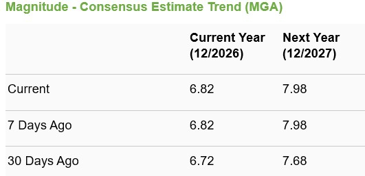 The Zacks Consensus Estimate for MGA’s 2026 and 2027 EPS implies year-over-year growth of 19% and 17%, respectively. The consensus mark for both 2026 and 2027 has moved north over the past 30 days.