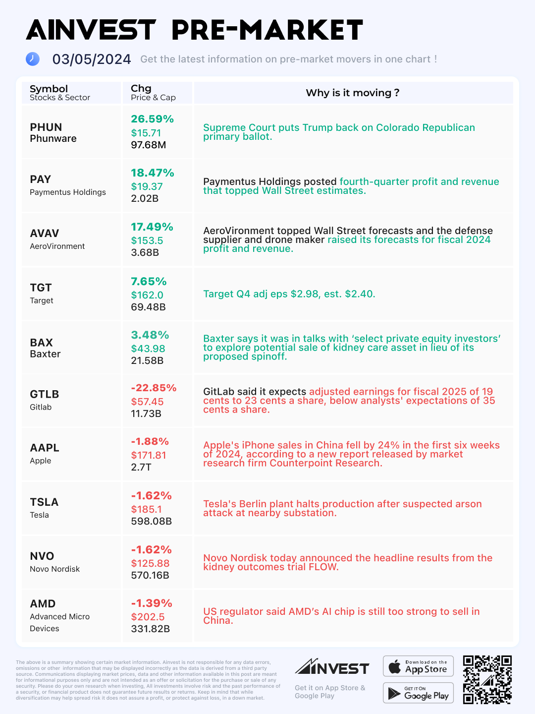 Mar. 05 Pre-market Movers Board: Apple shares fell 2% after iPhone sales in China plunged 24% at the start of 2024