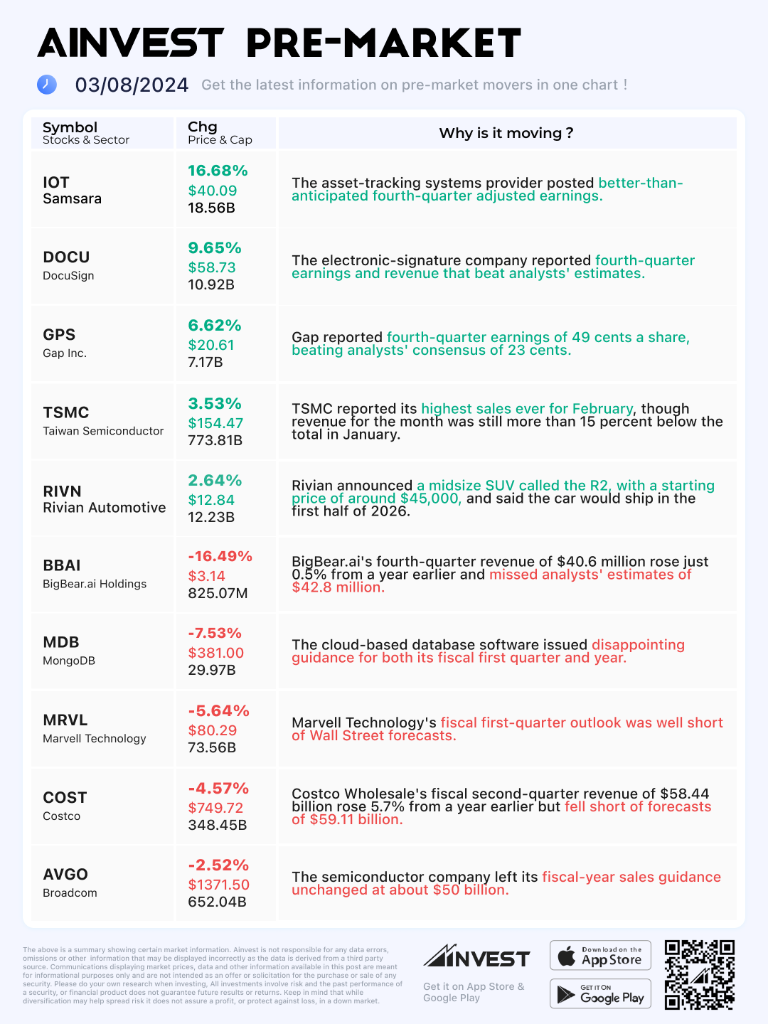Mar. 08 Pre-market Movers Board: TSMC rose 3.5% after sales gained 9.4% in first two months