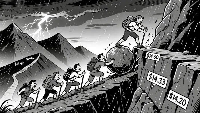 A doji appeared briefly around $14.60, suggesting short-term indecision. Critical support levels identified include $14.42, $14.33, and $14.20, while key resistances are now at $14.68 and $14.75 based on the most recent swing.