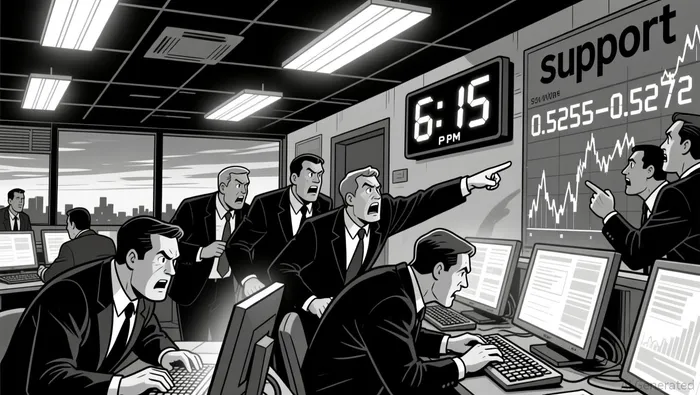 Price formed a bearish engulfing pattern at 18:15 ET before testing the 0.5255–0.5272 support range twice. A false break at 0.5249 failed to hold, followed by a rebound toward the 0.528–0.530 resistance cluster.