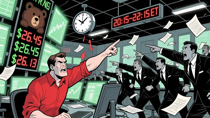 Short-term moving averages (20/50 periods on the 5-minute chart) crossed below price during the late ET hours, reinforcing the bearish bias. The RSI dipped below 30, entering oversold territory around $26.13, but no immediate bullish divergence emerged. The MACD histogram showed a rapid bearish expansion during the 23:15–23:45 ET window, confirming the sharp price fall.