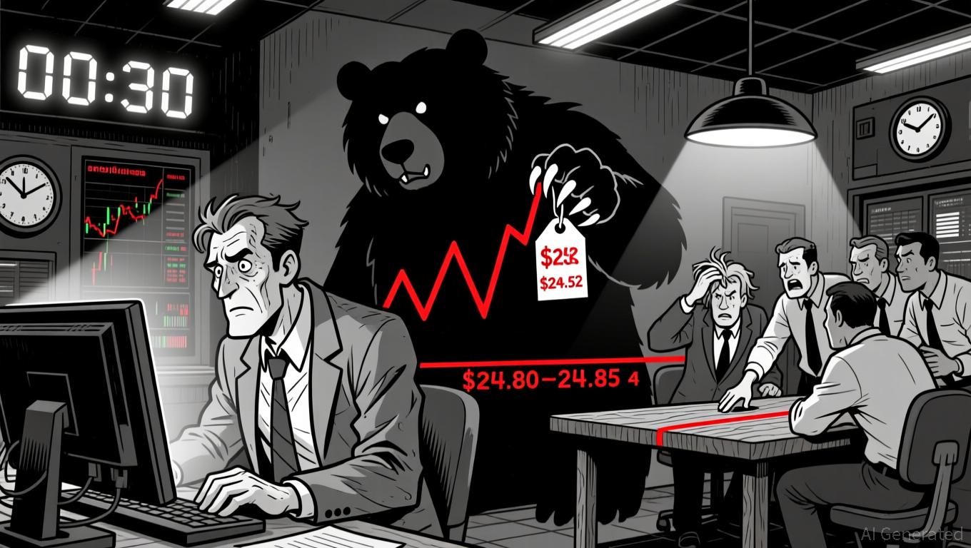 Price formed a bearish trend, dropping from $25.54 to a 24-hour low of $24.52. Key support levels emerged near $24.80–24.85, where price consolidated for several hours. A bearish engulfing pattern at 00:30 ET and a long lower wick in the 02:00–02:15 ET candle suggest strong rejection in that area.