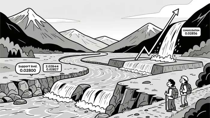 A bullish engulfing pattern emerged near the 0.02800 support level in the late evening hours, followed by a failed bearish attempt at 0.02894. The 5-minute chart shows a consolidation around 0.02856 after a midday breakout, with key resistance at 0.02844 and 0.02827 offering clustered levels that may determine the next directional move.