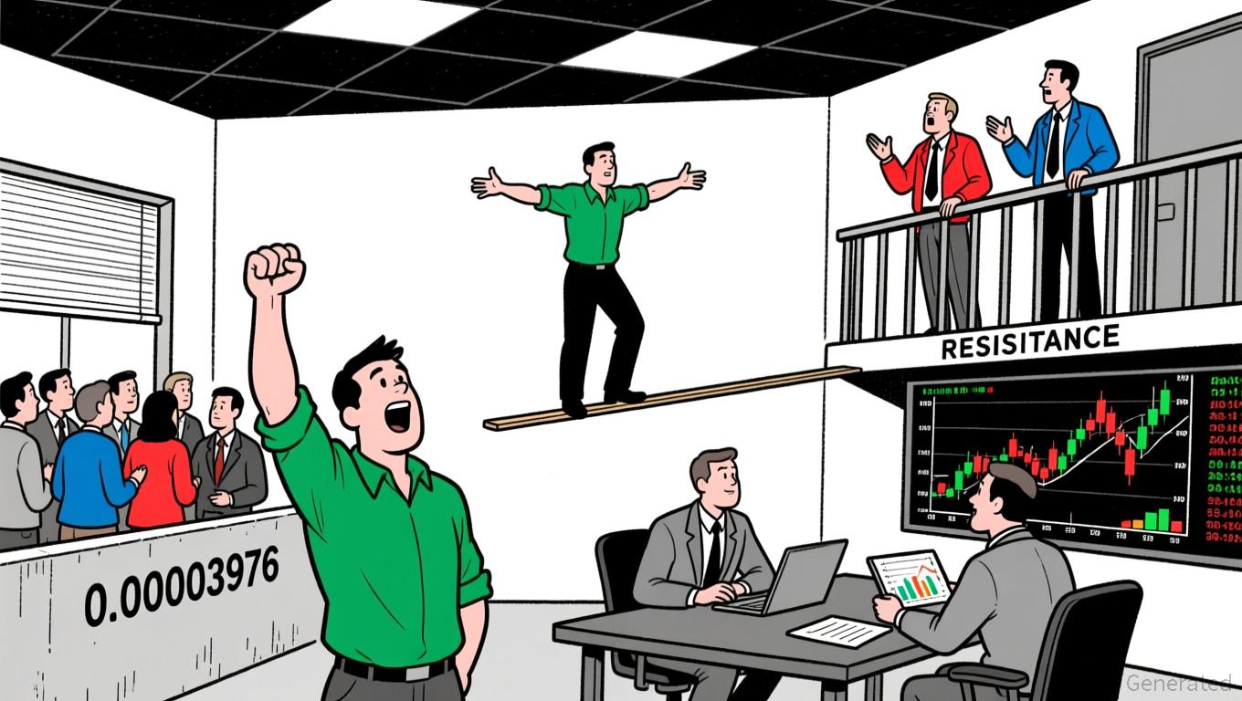 The 20-period and 50-period moving averages on the 5-minute chart crossed below the price during the early morning sell-off but have since converged near 0.0000405. On a daily chart, the 50-period MA sits at 0.0000408, suggesting a potential near-term pivot point if the 200-period MA is approached.