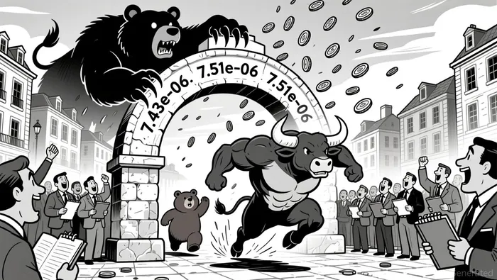 Fibonacci retracements from the 7.43e-06 to 7.51e-06 swing show 7.46e-06 as a critical 38.2% support and 7.49e-06 as a key 61.8% resistance. The price currently appears to be consolidating near the 7.5e-06 level, which aligns with the 50-period MA on the daily chart and could become a pivotal level in the next 24 hours.