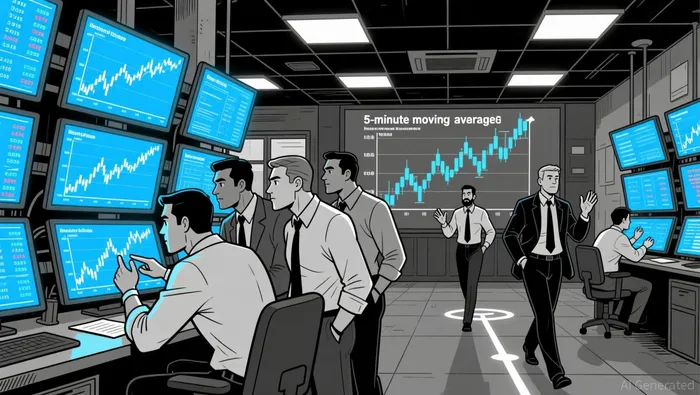 On the 5-minute chart, the 20-period and 50-period moving averages are closely aligned, with price oscillating slightly above and below them.