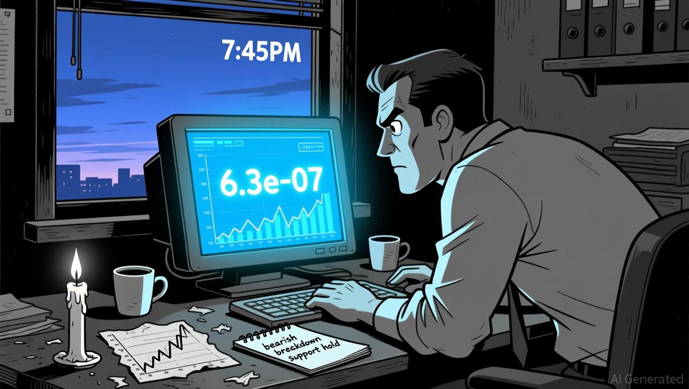 • Price action showed a bearish breakdown below key support at 6.3e-07, with low volume confirmation.