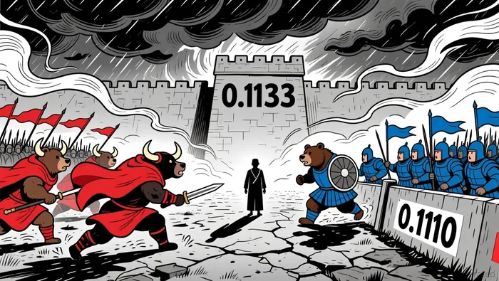 Volatility expanded early in the session as the price approached resistance, pushing the upper band to 0.1133. The current price sits near the middle band, with the lower band at 0.1105, indicating a potential for either a breakout or a consolidation phase.
