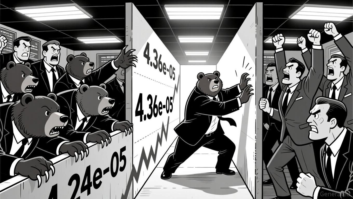 • Key resistance appears near 4.36e-05 while support is near 4.24e-05, with price bouncing off both levels multiple times.