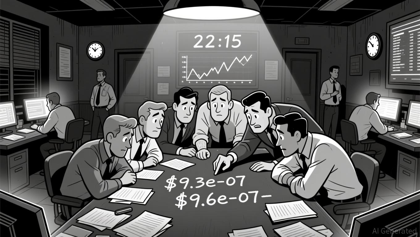 Price remained tightly consolidated around $9.3e-07 to $9.6e-07 throughout the day, with a key bullish engulfing pattern forming at 22:15 ET. This pattern did not lead to a sustained breakout, however, as subsequent candles showed minimal follow-through. A potential support level appears to be forming near $9.3e-07, with no strong resistance above $9.6e-07 confirmed yet.