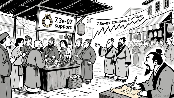 • No major candlestick patterns emerged, but price appears to find support around 7.3e-07.