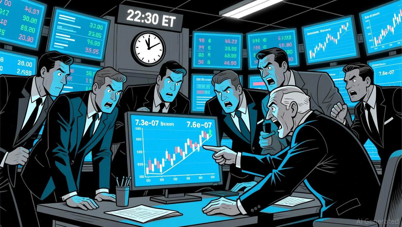 Price action on the 5-minute chart formed multiple narrow-range consolidation patterns, with key support identified around 7.3e-07 and resistance near 7.6e-07. A bearish breakdown occurred around 22:30 ET as the price dipped from 7.6e-07 to 7.5e-07 on increased volume, suggesting short-term bearish sentiment. A notable bearish engulfing pattern emerged at 22:30 ET, confirming the downward move.