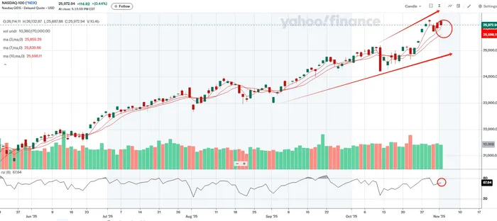 The charts reveal much of the story. Both the S&P 500 and Nasdaq 100 reached new highs on last Wednesday, just before MicrosoftMSFT--, MetaMETA--, and GoogleGOOGL-- released their earnings. This pattern is common as investors often take profits ahead of major tech results, particularly when high valuations demand even stronger earnings to justify them. Sometimes these pullbacks offer new entry points, as fundamentals remain broadly intact. Technically, the short-term moving average (MA3) has crossed the MA7 and MA10, not yet forming a clear bearish signal but suggesting the need for vigilance. Meanwhile, the RSI at 63 indicates a neutral zone, leaving room for either an upward continuation or a potential retracement.