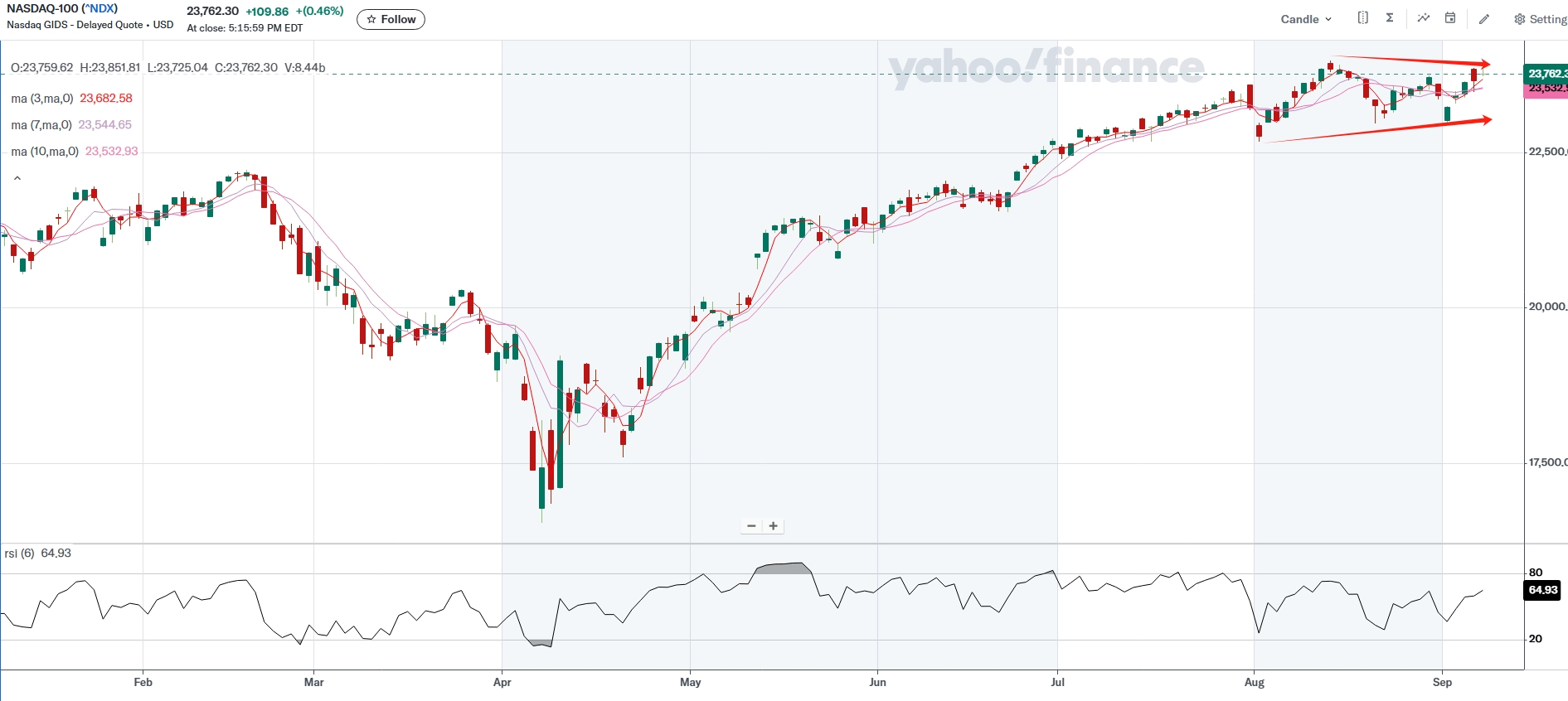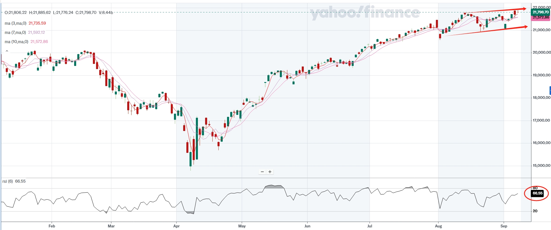 The Nasdaq Composite reached a new intraday high Monday, led by small and mid-cap names rather than the larger caps. OCTO, for instance, surged 3000% after adopting Sam Altman–backed Worldcoin as a treasury asset. The speculative mania reflects renewed enthusiasm around asset tokenization and partnerships with high-profile names. From a technical standpoint, the broader index continues to form a traditional bullish pattern of higher lows and higher highs, making investors more comfortable adding exposure. The RSI sits at 66.5—elevated but not extreme—suggesting