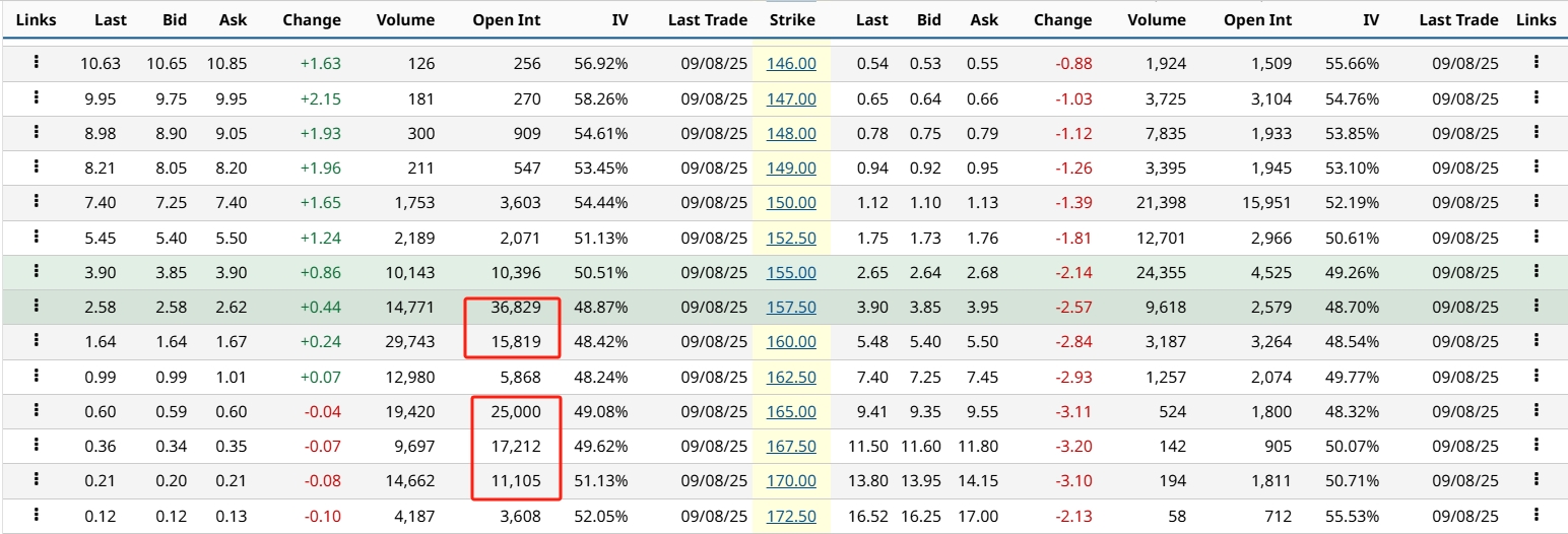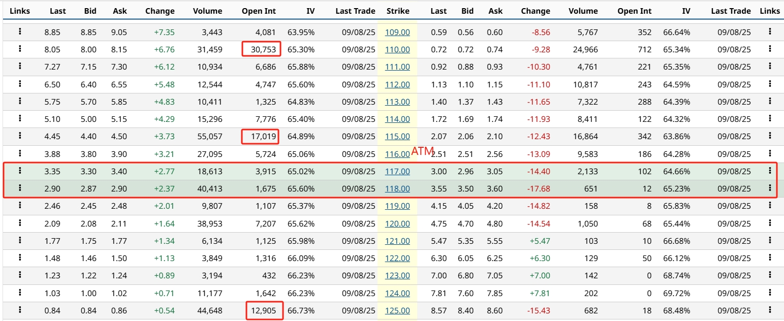 Robinhood (HOOD) jumped 16% Monday after being added to the S&P 500, yet investors are betting on more gains. Nearly 129,000 out-of-the-money $125 calls remain open, the third-most-active contracts expiring this Friday, implying about 6.5% upside from Monday’s close. With the stock trading just below its August high, a breakout above resistance could validate further momentum.