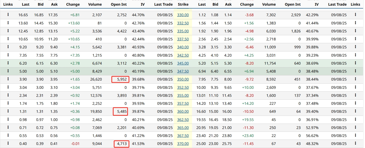 Broadcom (AVGO) surged following solid earnings and a $10 billion OpenAI deal to launch chips next year. Call option activity expiring Friday is heavily concentrated in out-of-the-money strikes, with 5,952 and 5,485 contracts on the $350 and $360 calls respectively, plus another 4,713 at the $370 strike—well above the current price.