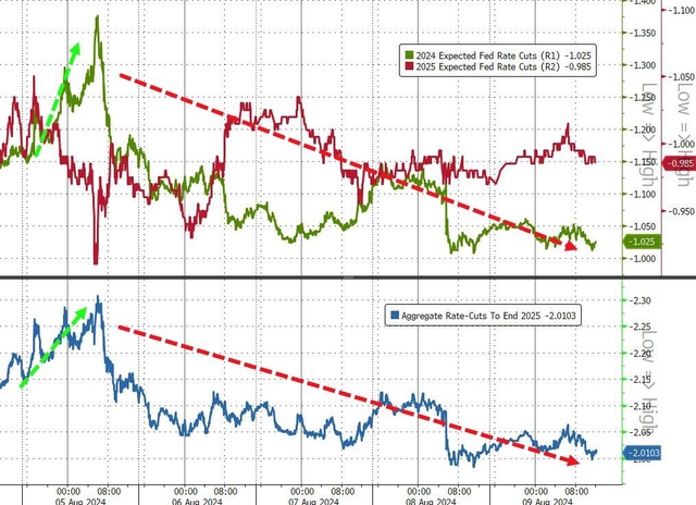 Expectations for interest rate cuts continued to fall from their levels on Monday, with economists believing it highly unlikely for the Federal Reserve to cut rates between meetings. A Bloomberg survey showed that nearly three-quarters of economists expect the Fed to only cut rates by 25 basis points at its September 17-18 meeting, contrary to the calls for a significant cut by major Wall Street banks, with the remainder predicting a larger cut. The median forecast suggests only a 10% chance of an emergency rate adjustment before the September meeting.