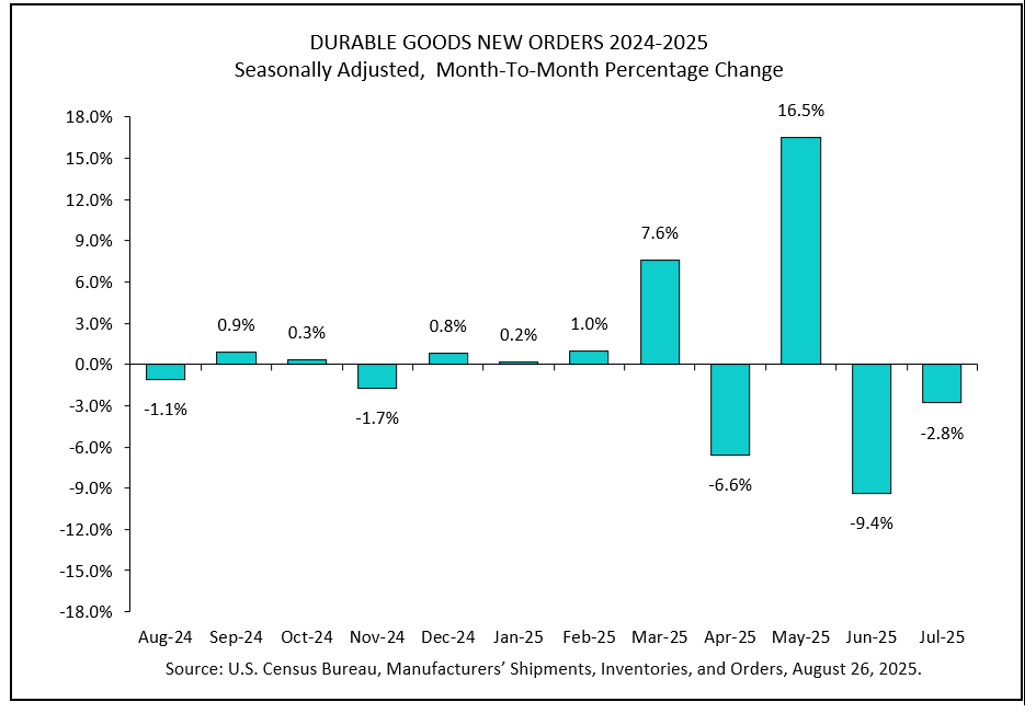 that durable goods orders fell 2.8% in July to $302.8 billion, extending a revised 9.4% plunge in June. The back-to-back declines underscore mounting pressure on manufacturers as tariffs and global strains weigh on demand.