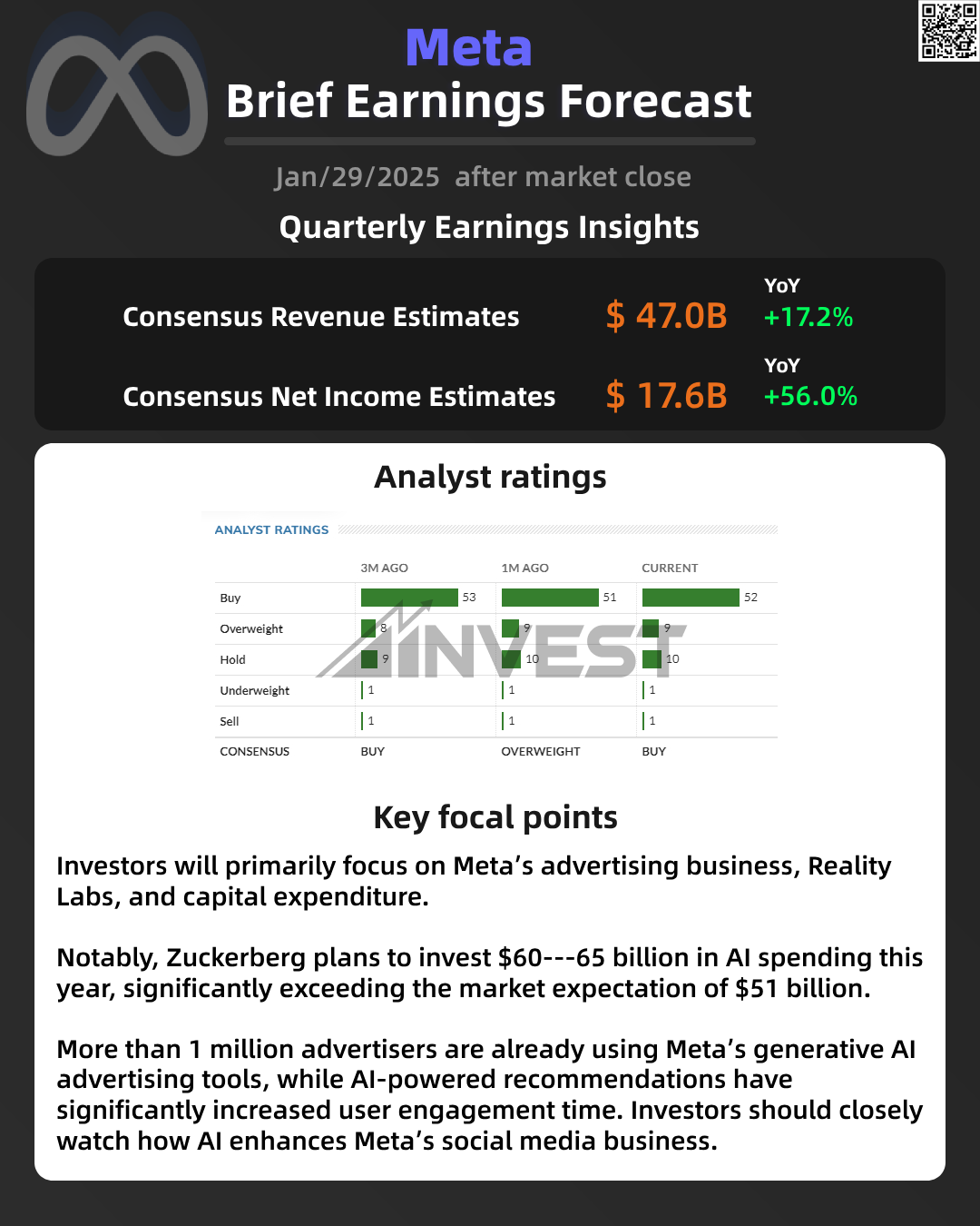 Meta is set to release its latest earnings report, with investors closely monitoring its advertising business, Reality Labs, and capital expenditure trends. Notably, Mark Zuckerberg recently announced plans to allocate $60–65 billion to AI spending this year, significantly exceeding the market's expectation of $51 billion.