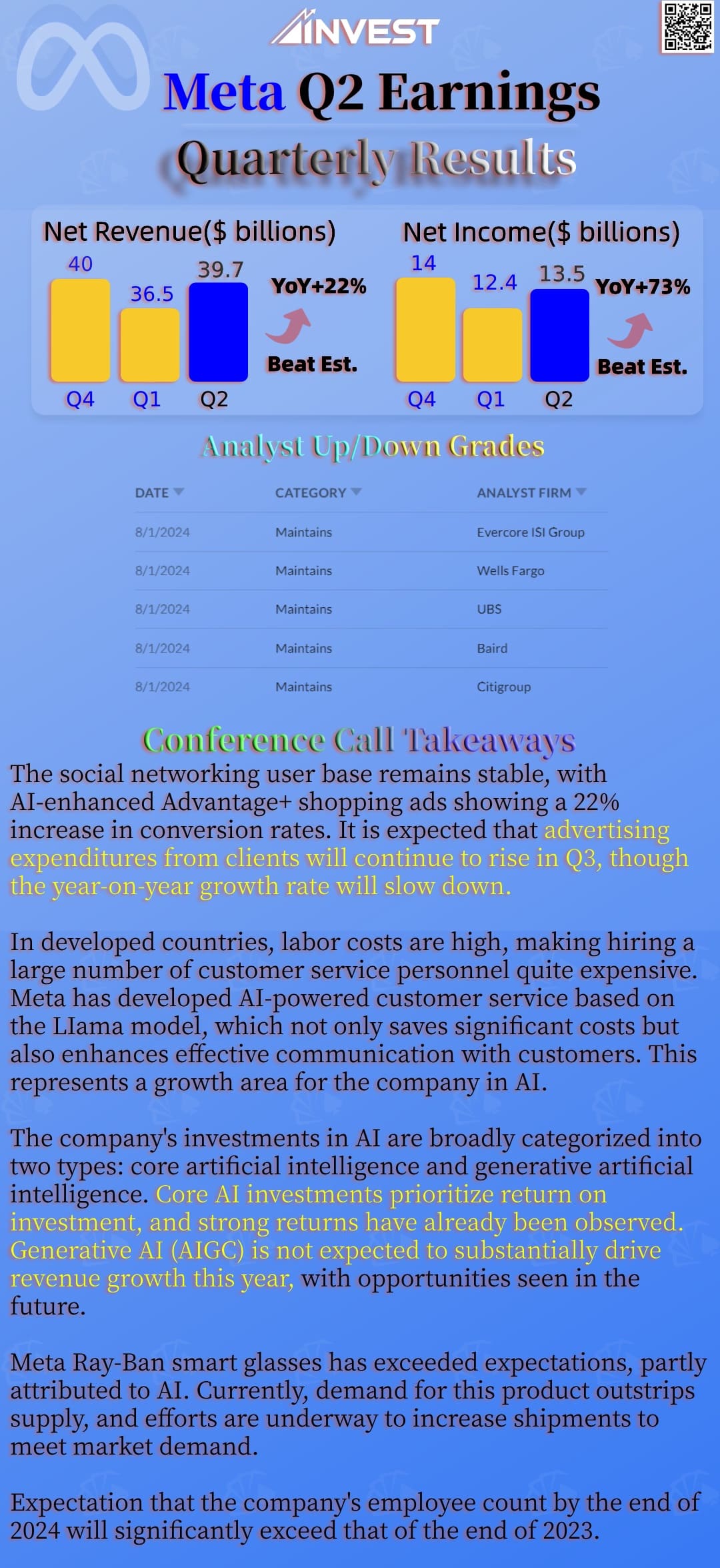 Performance of Ray-Ban smart glasses exceeded expectations, with demand outstripping supply. Significant increase in employee numbers expected by the end of 2024.