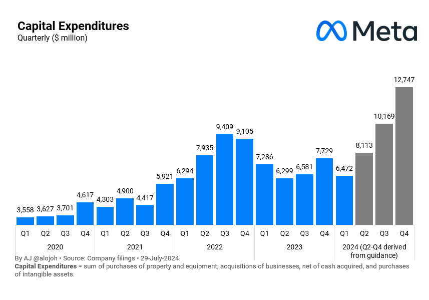 In this quarter, Meta spent $8.47 billion, lower than the market's expected $9.5 billion. The full-year 2024 capital expenditure is projected to range from $37 billion to $40 billion (previously estimated at $35 billion to $40 billion), with the lower limit raised by $2 billion, although the upper limit remains unchanged. This adjustment helped ease worries about extravagant spending. However, Meta's management indicated that capital expenditures for 2025 could see a substantial increase.