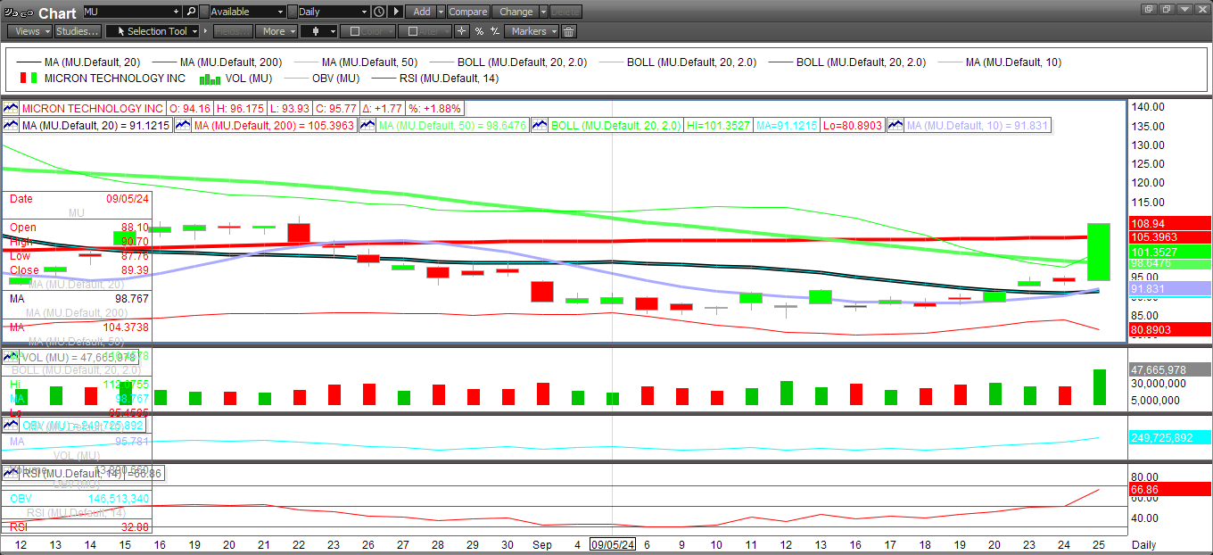 As we noted in our preview, expectations for MU were low as the stock had slipped 40% since hitting all-time highs in late June. There was concern that Micron would follow Broadcom (AVGO) and provide a conservative outlook. MU was able to outpace expectations bot for the quarter and in its outlook which is driving shares higher. the stock is up 12% in after hours and is attempting to break above its 200-sma ($105).