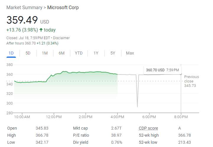These announcements created new announcements for this tech giant, and following the event, Microsoft's stock price temporarily reached a new all-time high of $366.78 but eventually closed at $359.49, still marking a 4% jump.