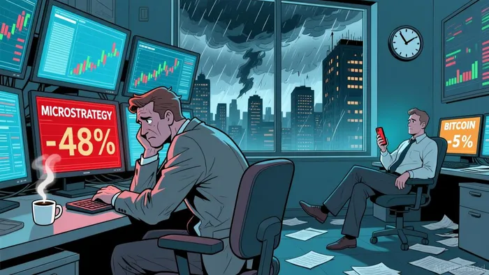 The story of MicroStrategy in 2025 is one of extreme leverage meeting a sharp market downturn. The stock fell 48% last year, a brutal performance that significantly underperformed the broader crypto market. While BitcoinBTC-- itself declined by about 5% over the period, the company's shares plunged far more deeply. This wasn't a divergence from the trend but an amplified version of it. From its peak in June 2025, shares fell 62% as investor fear and Bitcoin's price drop eroded its significant valuation premium, while Bitcoin's own decline from its October high was roughly 27%.