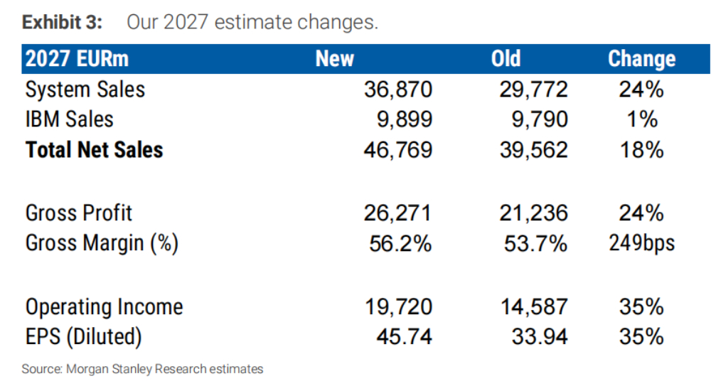 Morgan Stanley forecasts ASML’s fiscal 2027 revenue at approximately $51.5 billion, with EBIT reaching $21.7 billion and gross margin rising to 56.2%.