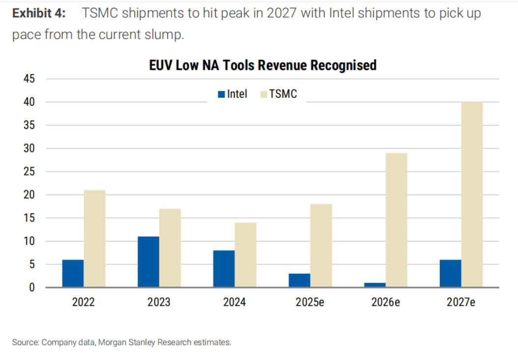 Beyond TSMC, improving process execution at Intel and Samsung is also expected to translate into tangible demand. Morgan Stanley estimates that each company will purchase 5–6 EUV tools in 2027 for foundry and logic operations.
