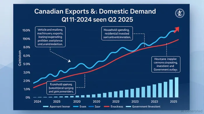 Canada’s Q2 GDP contraction of 1.6% on an annualized basis—its first decline in seven quarters—has thrust the economy into a precarious crossroads [1]. The collapse of exports, driven by U.S. tariffs on steel, aluminum, and autos, slashed shipments of passenger vehicles (-24.7%), industrial machinery (-18.5%), and travel services (-11.1%) [2]. Yet beneath this external shock lies a story of domestic resilience. Household spending surged 4.5%, fueled by robust services and durable goods demand, while government outlays rebounded 5.1% and residential investment climbed 6.3% [3]. This dichotomy—export weakness versus domestic fortitude—frames the central question for investors: Can Canada’s internal demand sustain growth while the Bank of Canada navigates the trade-off between rate cuts and inflation control?