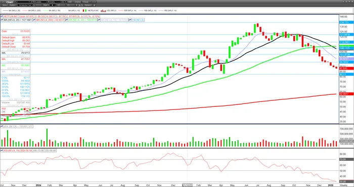 All of that brings us back to the stock setup. NFLX has become one of the cleaner “buy the dip if the story holds” names in large-cap tech/communication services, but it’s also the kind of stock that doesn’t get rescued if the market senses complacency. With the chart leaning bearish and the stock already down hard, the reaction function is pretty clear: a strong print with steady guidance can spark a snapback rally because positioning is likely defensive and sentiment is already bruised. But if the company disappoints on growth cadence or creates new uncertainty through deal talk, the stock is vulnerable to a flush through support as technical sellers press the breakdown.