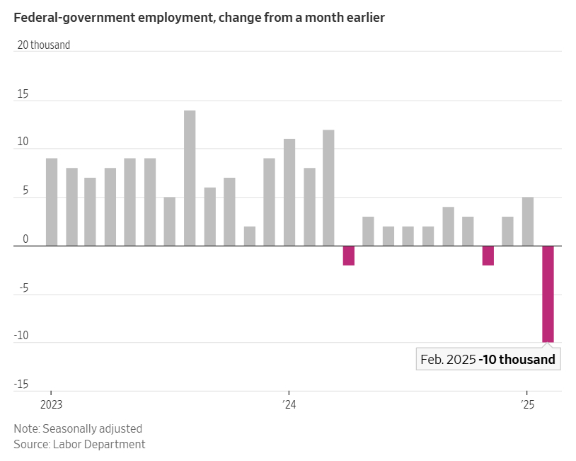 Federal government employment saw its steepest drop since June 2022 due to Musk's aggressive efficiency reforms.