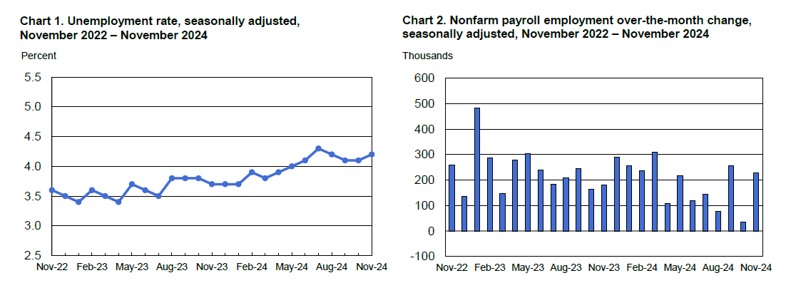The US added 227,000 non-farm payroll jobs in November, exceeding forecasts of 218,000. The unemployment rate ticked up to 4.2%, higher than the expected 4.1%.