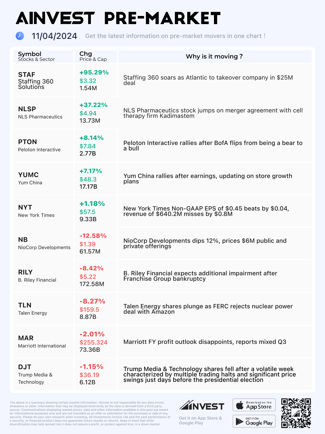 Nov. 04 Pre-market Movers Board: Staffing 360 soars as Atlantic to takeover company in $25M deal