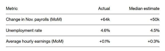 “Both October and November employment data look weak,” said Bloomberg economists Anna Wong, Stuart Paul, and Chris G. Collins. “Private-sector hiring is improving only marginally. While massive AI data-center demand supports construction jobs, hiring concentration in just a few sectors is concerning. In hindsight, December’s rate cut was the right decision.”