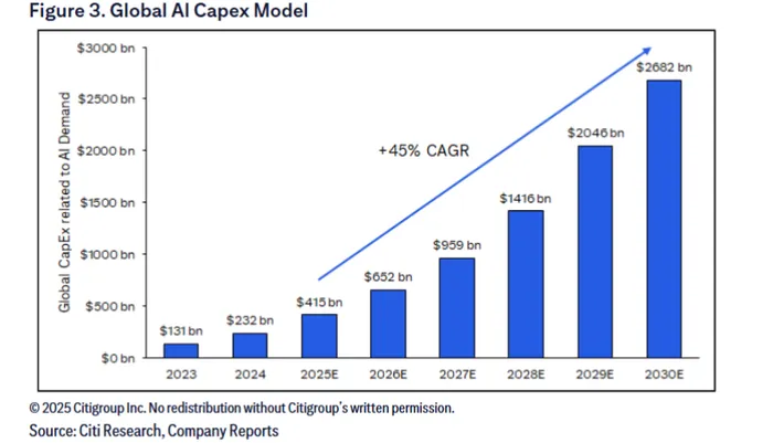 Citi forecasts global AI capital expenditure to reach USD 415 billion in 2025 and USD 2.682 trillion by 2030—a five-year CAGR of 45%.