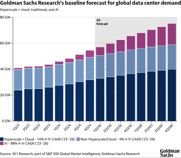 Goldman Sachs expects global data-center demand to surge from 40 GW in early 2023 to 80 GW by the end of 2026, with Nvidia capturing the largest share of the build-out.