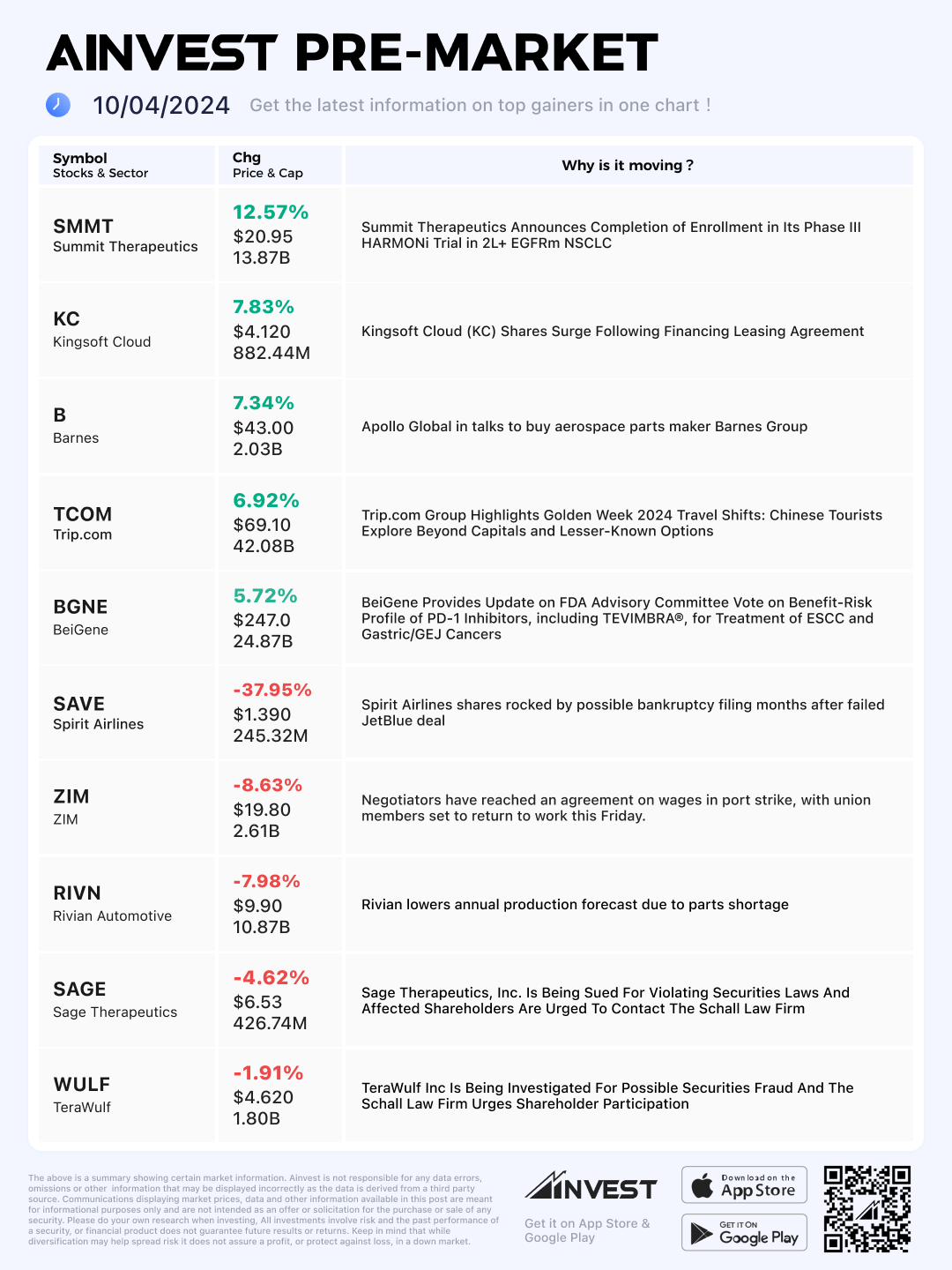 Oct. 4 Pre-market Movers Board: Spirit Airlines Stock Plunges on Report of Potential Bankruptcy Filing