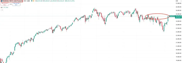 Now let's move to the Nasdaq 100 future. From a technical perspective, the surge has pushed Nasdaq 100 futures back toward a key resistance zone. Markets typically require time to consolidate at such levels, especially when driven by external catalysts. Investors will need to assess whether the ceasefire can hold and whether it represents a structural shift or merely a temporary pause. Without additional catalysts, the probability of a near term pullback increases, and upside momentum may face limits.