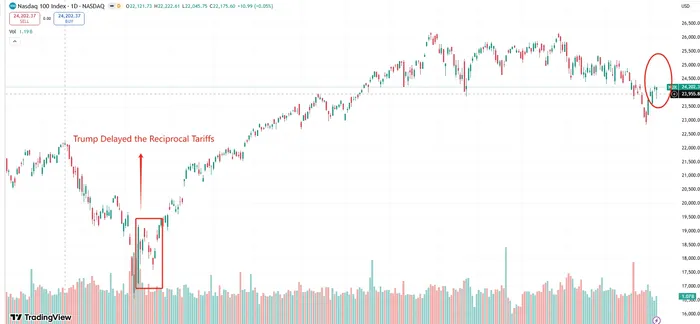 This setup closely resembles the pattern observed on April 9 last year. At that time, Trump announced a delay in aggressive reciprocal tariffs, allowing more time for negotiations, which triggered a 12% surge in the Nasdaq 100 in a single session. However, that rally quickly faded, with the index dropping 4% the following day and continuing lower as profit taking set in. The market eventually found a stronger base only after forming a higher low, which then supported a more durable bullish phase. A similar path could unfold here, meaning there is no urgency to chase the current move.