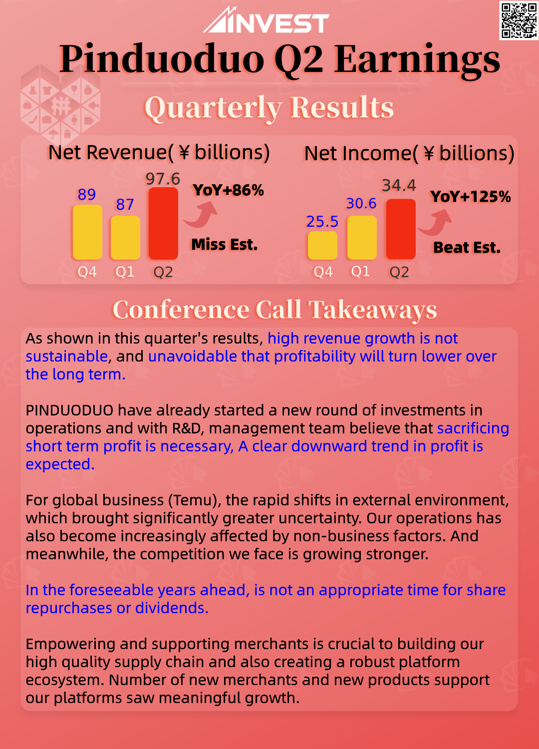 PDD reported disappointing Q2 results, revenue grew from a year earlier to $13.36 billion, but missed Wall Street’s estimates of $14.03 billion. After the report, PDD's share price fell 28.5% Monday to $100, their largest single-day percentage decrease ever.