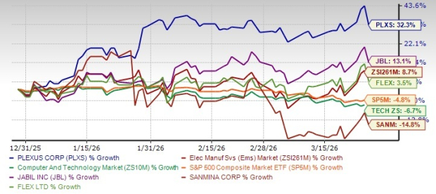 Plexus Corporation PLXS has emerged as a compelling performer in the electronics manufacturing services (EMS) space, with the stock price appreciating 32.3% over the past three months, outperforming the Electronic Manufacturing Industry’s growth of 8.7%. The S&P 500 composite and the broader Computer Technology Sector have declined 4.8% and 6.7%, respectively.