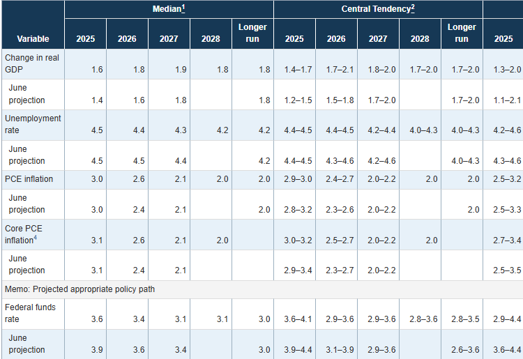 The Summary of Economic Projections released alongside the decision underscored that point. While the median forecast for the fed funds rate fell to 3.6% for 2025 from 3.9% in June, the 2026 and 2027 projections were only modestly lower, and inflation estimates for 2026 ticked higher. That mix suggested a gentler path of easing than markets had hoped, balanced by a recognition that inflation will take time to fully subside. Powell framed the SEP as a set of probabilities rather than a plan, reminding investors that policy is not on a preset course.