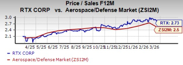 RTX is trading at a premium relative to the industry, with a forward 12-month price-to-sales of 2.73X compared with the industry average of 2.5X.