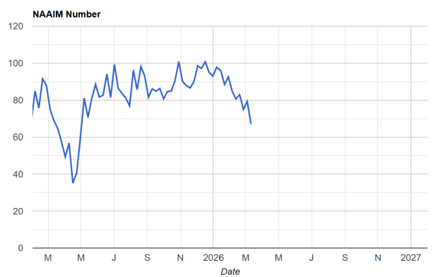 The National Association of Active Investment Managers (NAAIM) is a survey that represents the average exposure to U.S. Equity markets as reported by its members. NAAIM exposure printed its lowest level since May 2025.
