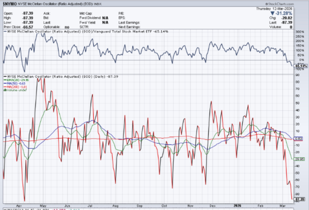 Market breadth, or participation, is one way to gauge how extreme market selling is. When the number of advancers reaches a very low level, it can signal to savvy investors that panic selling is underway, and sellers are likely to be exhausted soon. The McClellan Oscillator measures the Net Advances (Advances-Declines) on the New York Stock Exchange (NYSE) or S&P 500 (SPX). According to data from X user Subu Trade (@SubuTrade), “despite being within 5% of an all-time high, the SPX McClellan Oscillator is extremely oversold.” “This setup has occurred 10 times previously, and SPX was higher every single time one month later with an average gain of 3.2%.”